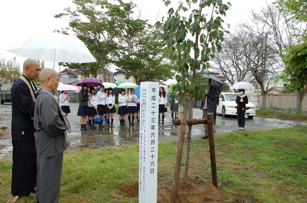 最初の1本目は、震災から3カ月後の6月に宮城県石巻市の弘文館高校の生徒の皆さんと植樹しました。